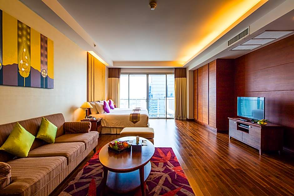 TWO BEDROOM EXECUTIVE is 1270 square feet and includes a king-size bed 150-183 width plus balcony, desk, hairdryer, ironing set, bathrobes, and slippers.